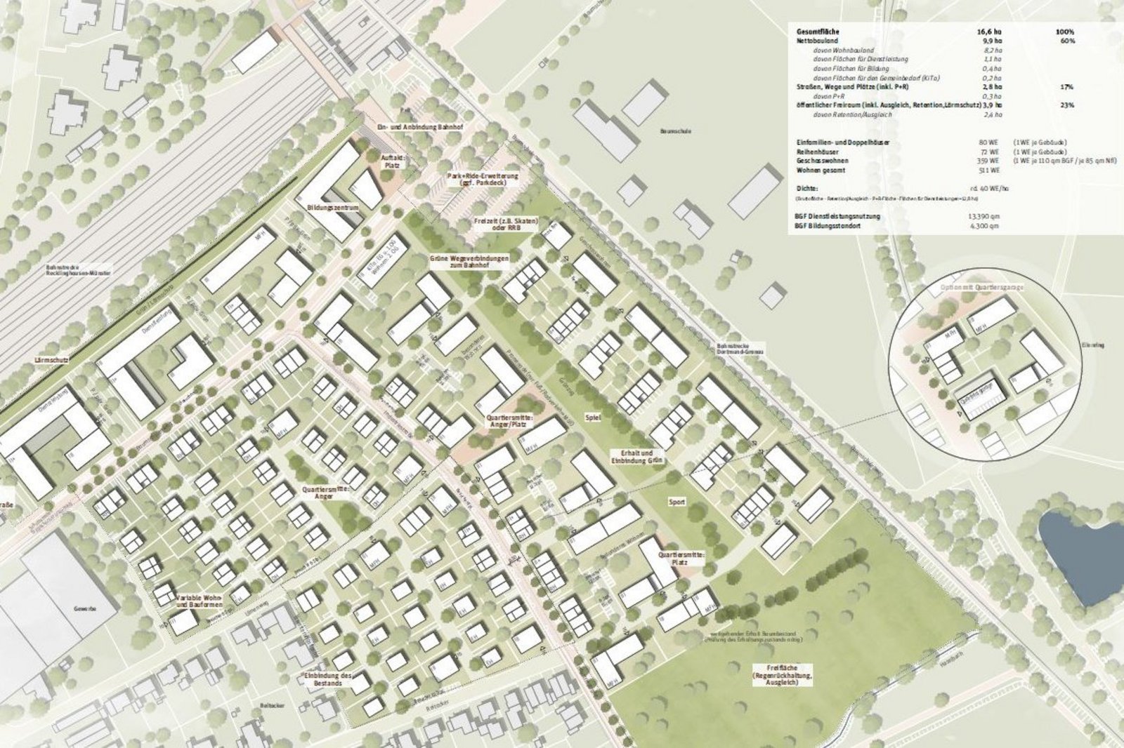 Bereits im Frühjahr 2021 hatten Bürgerinnen und Bürger die Gelegenheit, sich zu drei unterschiedlichen Planvarianten zu äußern. Die dabei positiv hervorgehobenen Aspekte hat die Stadt Dülmen in dem nun beschlossenen Rahmenplan zusammengeführt und weiterentwickelt. Insgesamt sieht der Rahmenplan die Errichtung von ca. 510 Wohneinheiten vor. Er zeichnet sich hierbei durch einen Mix an unterschiedlichen Wohnformen aus (freistehende Einfamilienhäuser, Doppelhäuser, Reihenhäuser, Mehrfamilienhäuser), sodass verschiedene Wohnwünsche und -ansprüche erfüllt werden können. Aufgrund der Nähe zum Bahnhof sind auch Dienstleistungs- sowie Bildungsstandorte Bestandteil der Planung. Zusammen mit weiteren Nutzungen wie einer Kita und besonderen Wohnangeboten wird das Konzept für die Quartiersentwicklung abgerundet.