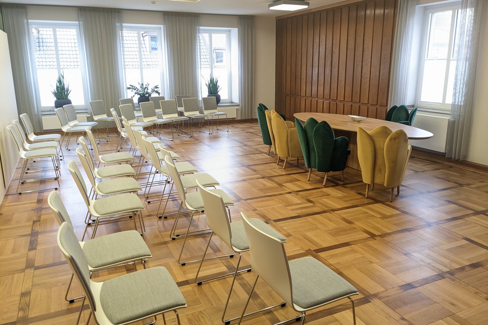 Im umgebauten, ehemaligen Ratssaal befindet sich seit kurzem das neue Trauzimmer im Rathaus. Bis zu 35 Gäste können bei einer Trauung in stilvoll-modernem Ambiente dabei sein. Nach der Trauung bietet das geräumige Foyer ausreichend Platz für einen Sektumtrunk. Bei schönem Wetter ist dies auch draußen auf dem Marktplatz möglich.