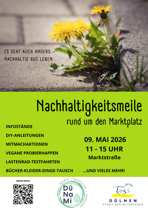 Am 09.05.2025 findet zum 5. Mal die Dülmener Nachhaltigkeitsmeile statt. Rund um den Marktplatz präsentieren sich von 11-15 Uhr Vereine, Initiativen, Unternehmen und weitere Akteure mit ihren nachhaltigen Ideen, Projekten und Produkten in Form von Infoständen, Mitmachaktionen, und einem Quiz mit schönen Gewinnen.