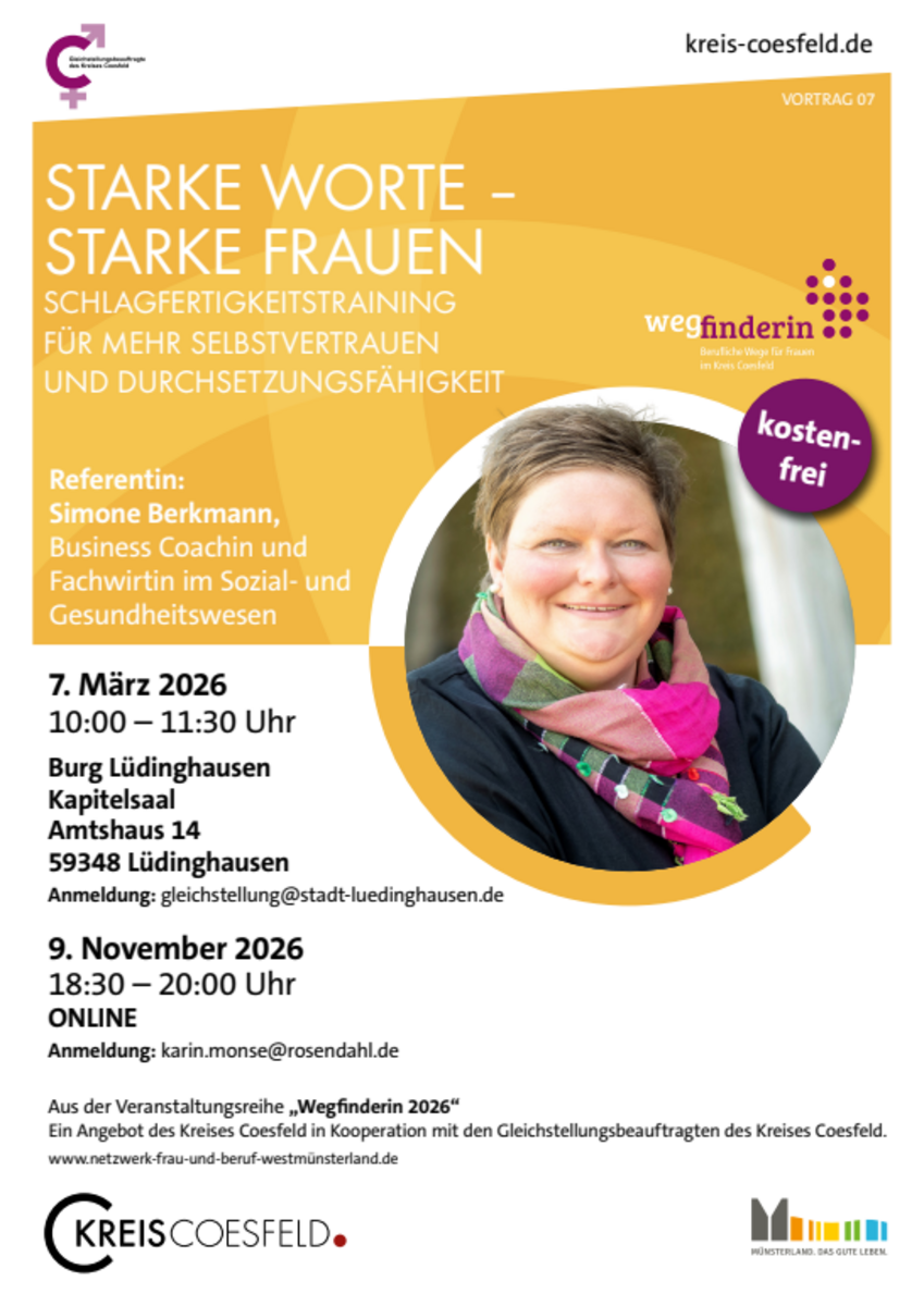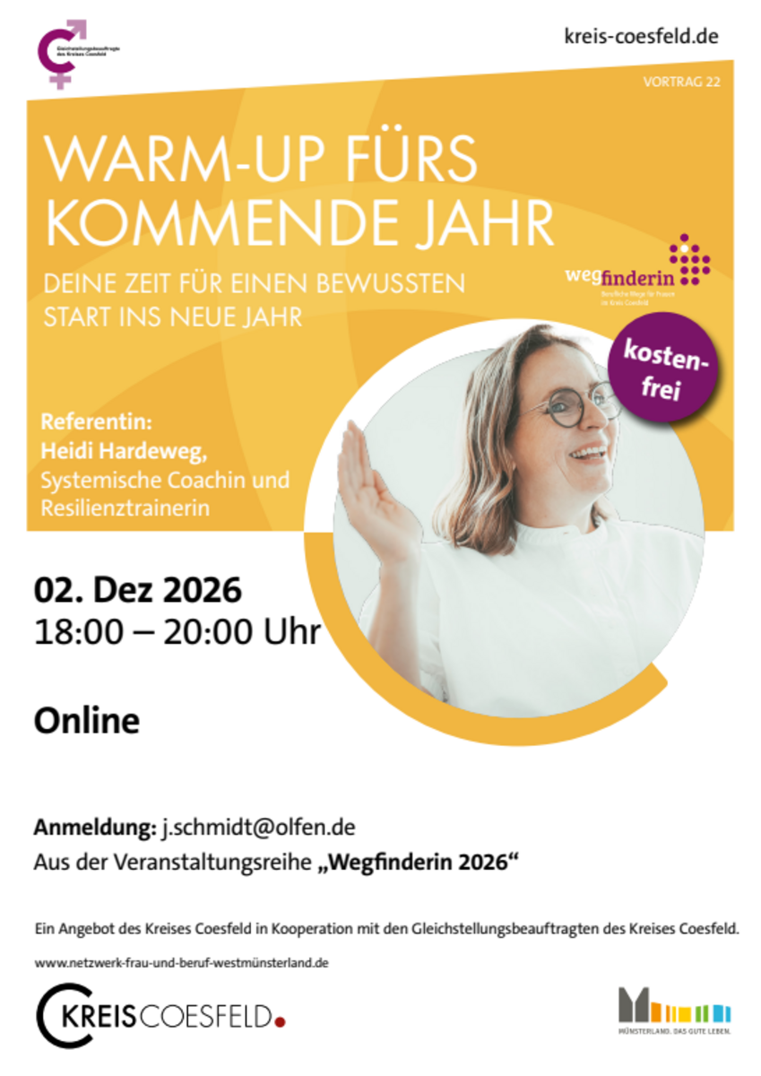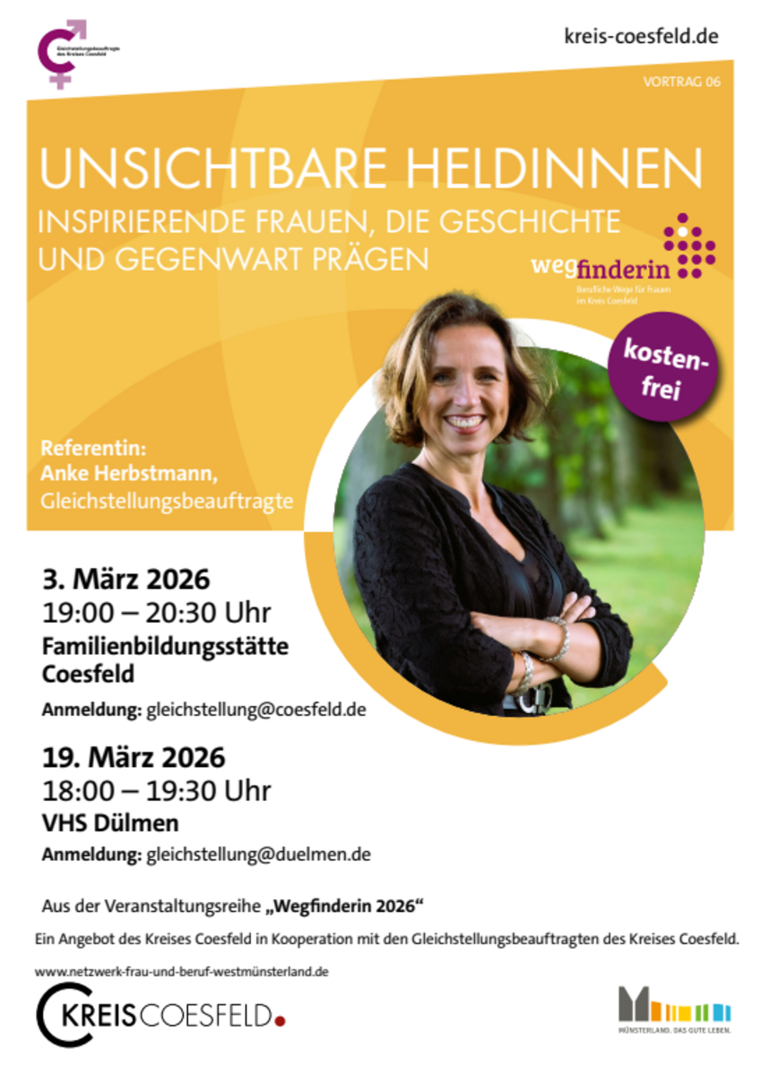 Der Vortrag findet im Rahmen der Veranstaltungsreihe "Wegfinderin - Einfach mal die Perspektive ändern" statt, die die Gleichstellungsbeauftragten im Kreis Coesfeld organisieren.