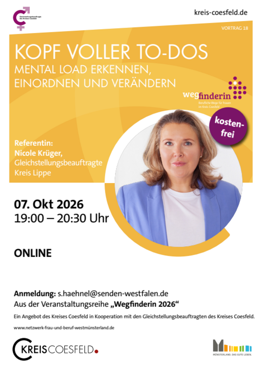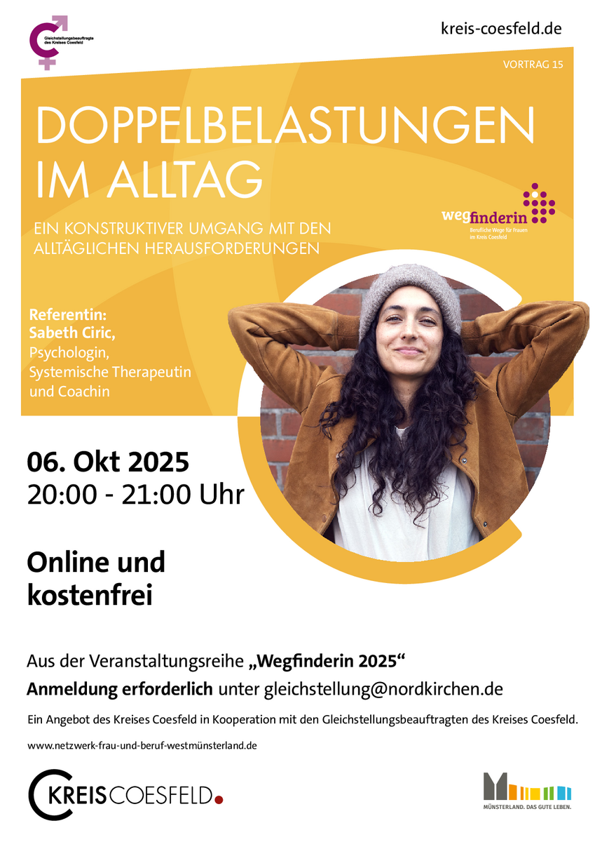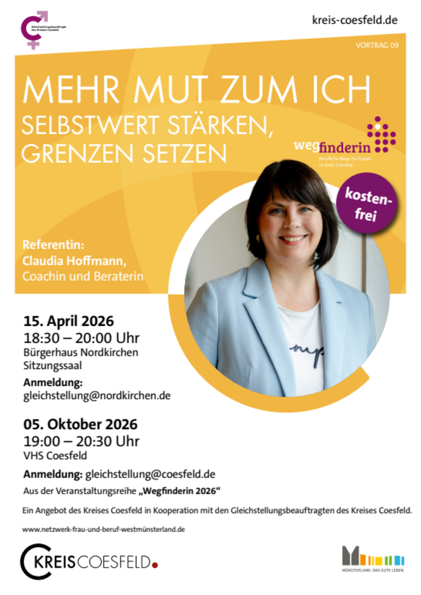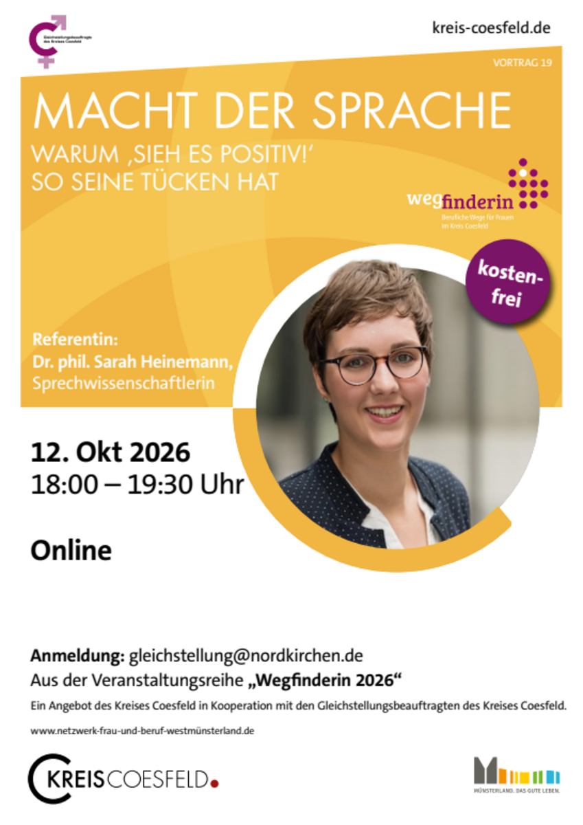 Anmeldung erforderlich: gleichstellung(at)nordkirchen.deDer Vortrag findet im Rahmen der Veranstaltungsreihe "Wegfinderin - Einfach mal die Perspektive ändern" statt, die die Gleichstellungsbeauftragten im Kreis Coesfeld organisieren.