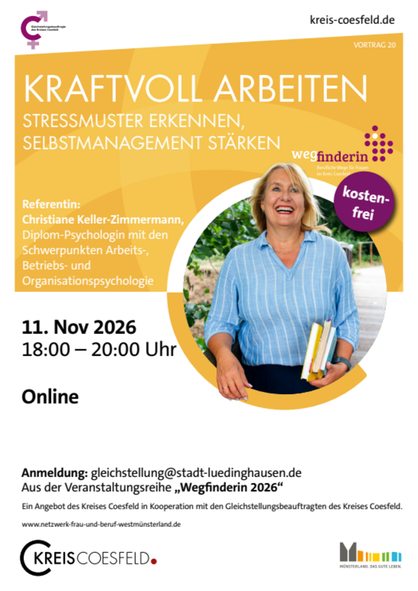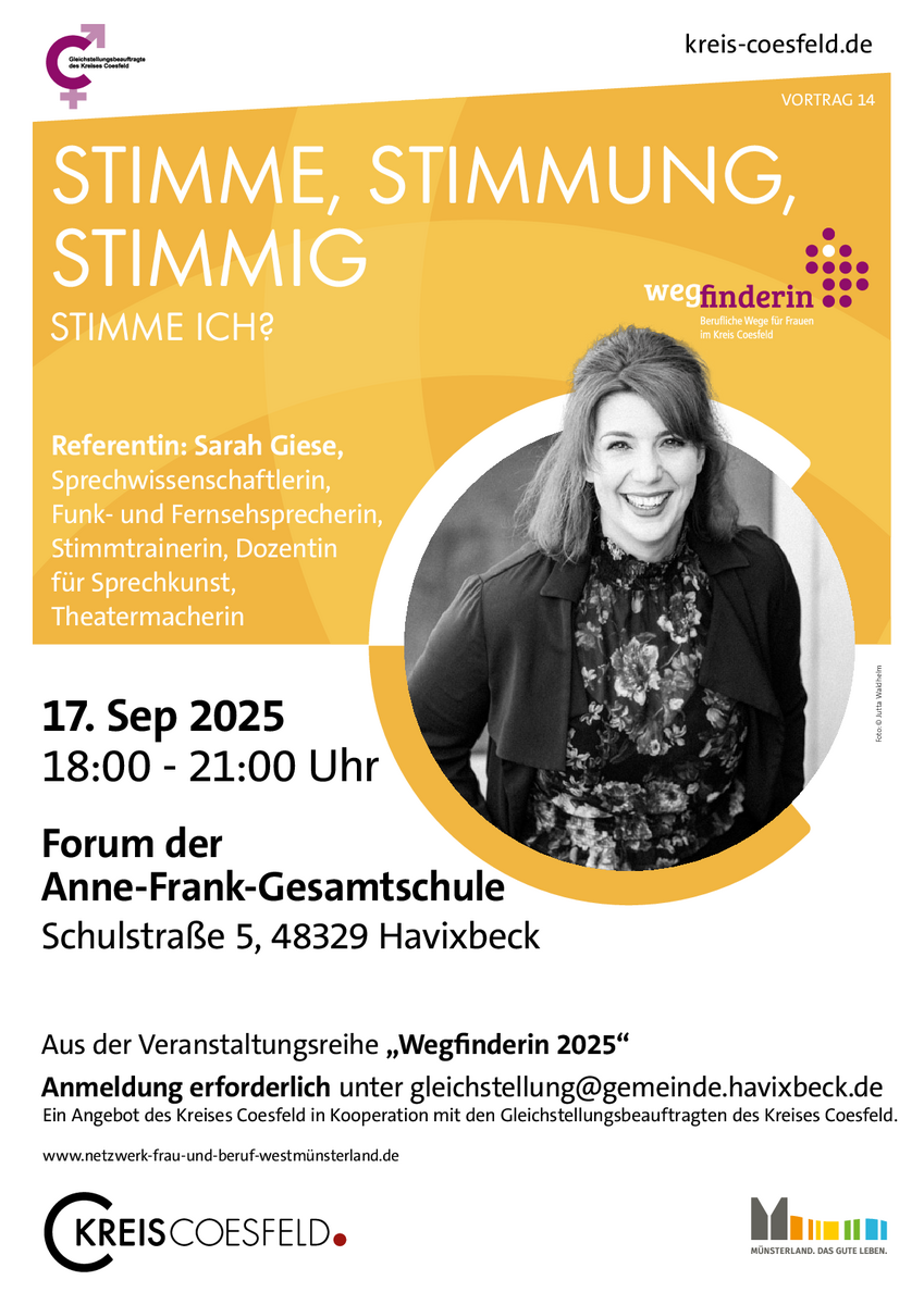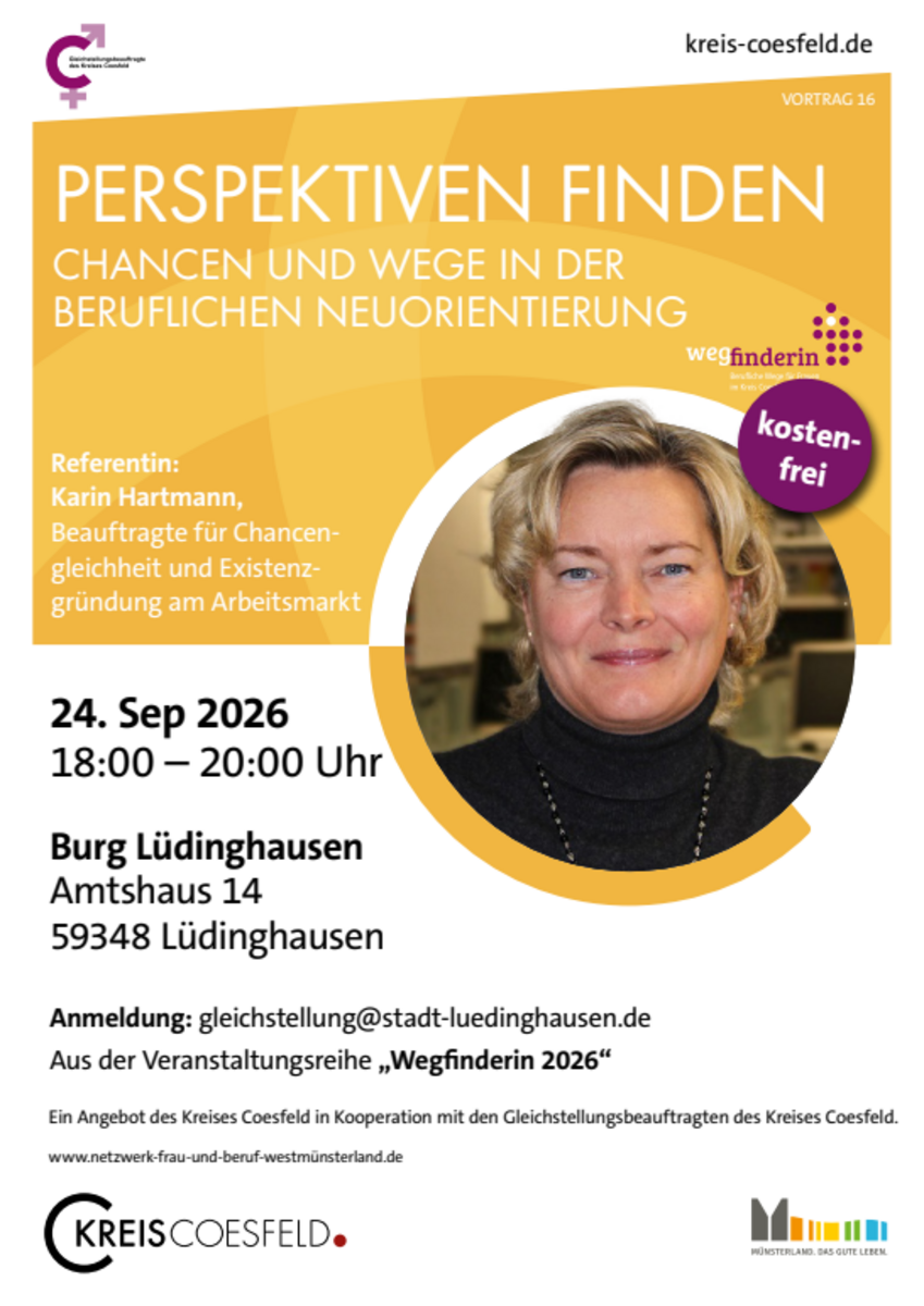 Anmeldung erforderlich: gleichstellung(at)gemeinde.havixbeck.deDer Vortrag findet im Rahmen der Veranstaltungsreihe "Wegfinderin - Einfach mal die Perspektive ändern" statt, die die Gleichstellungsbeauftragten im Kreis Coesfeld organisieren.