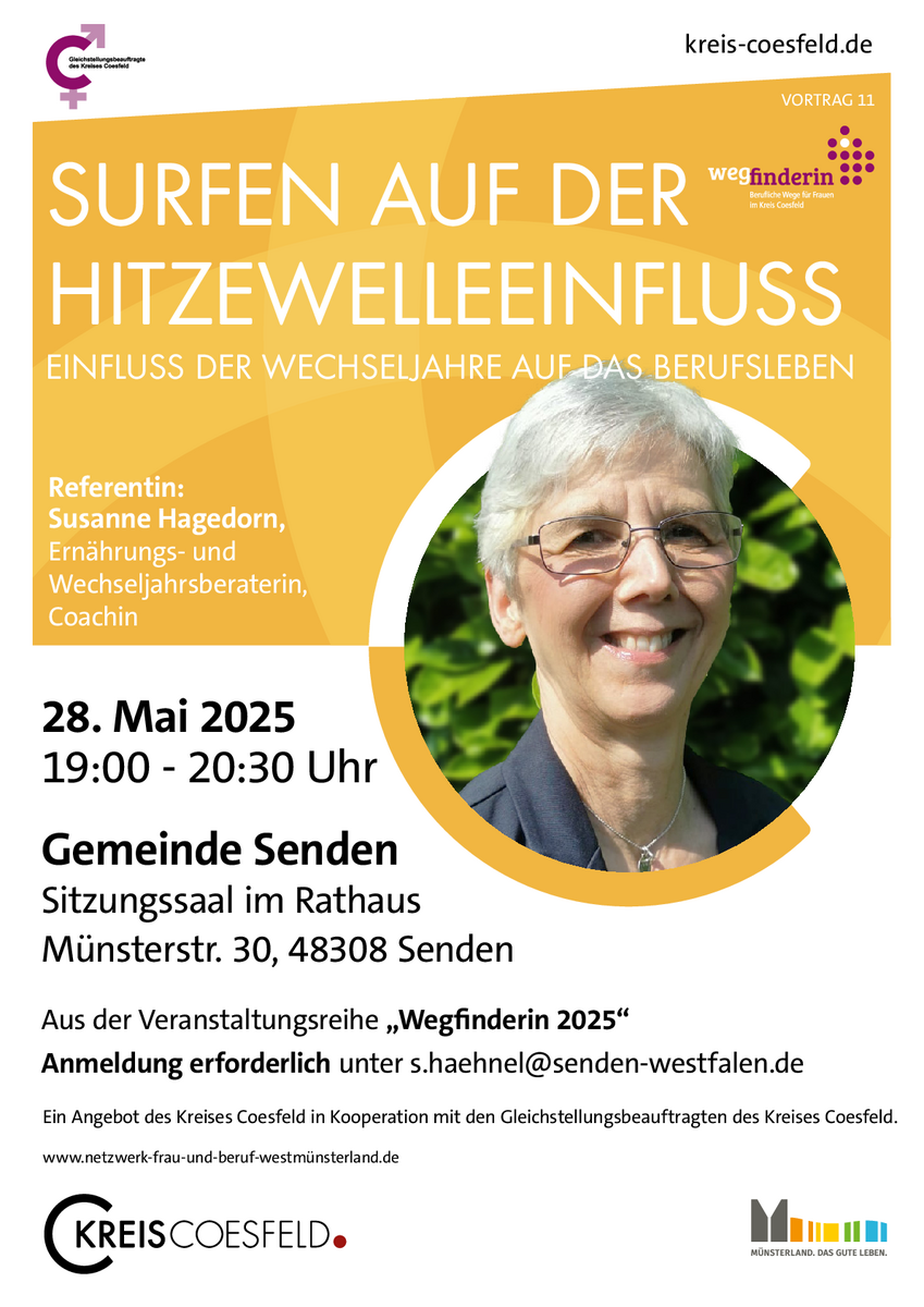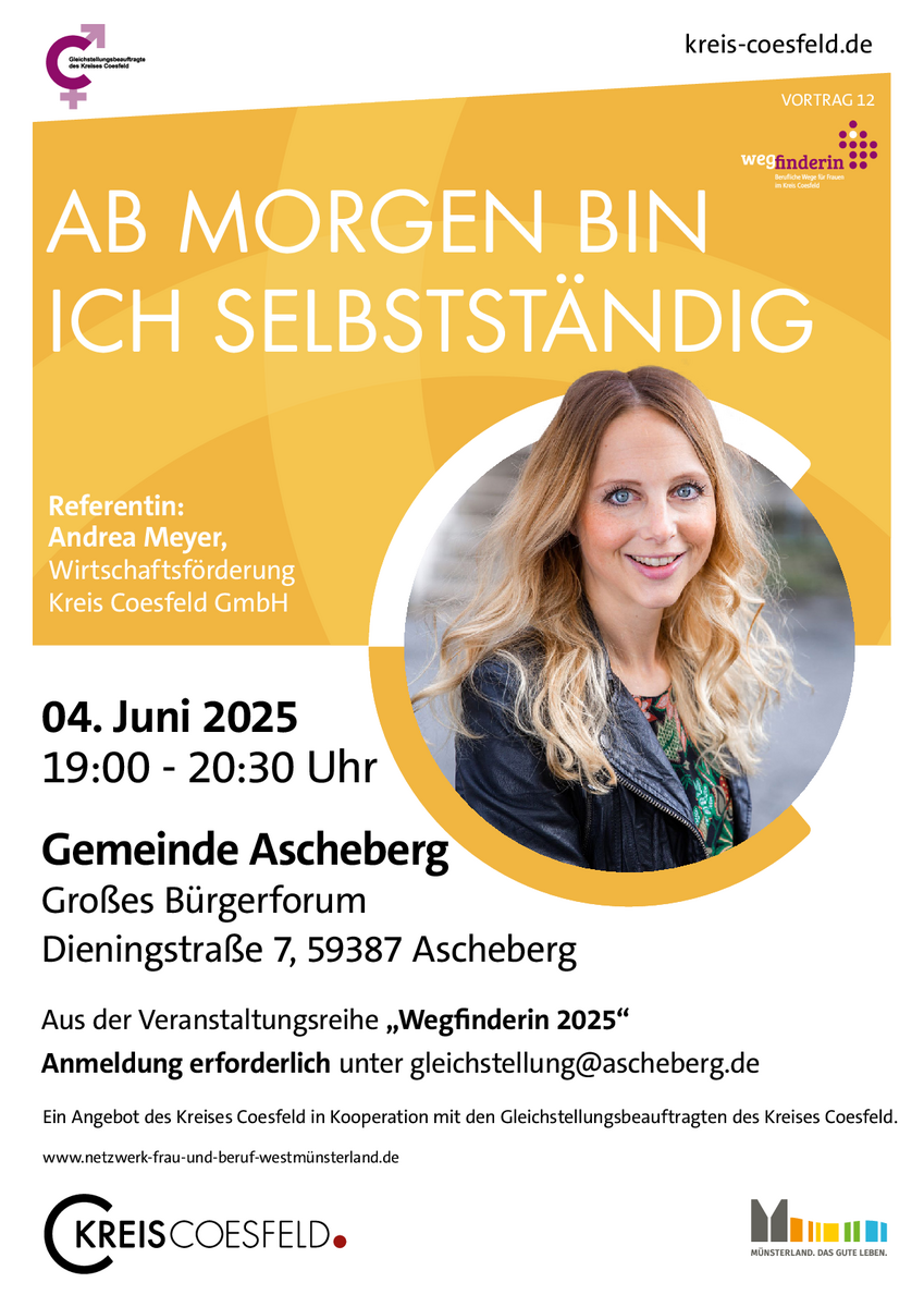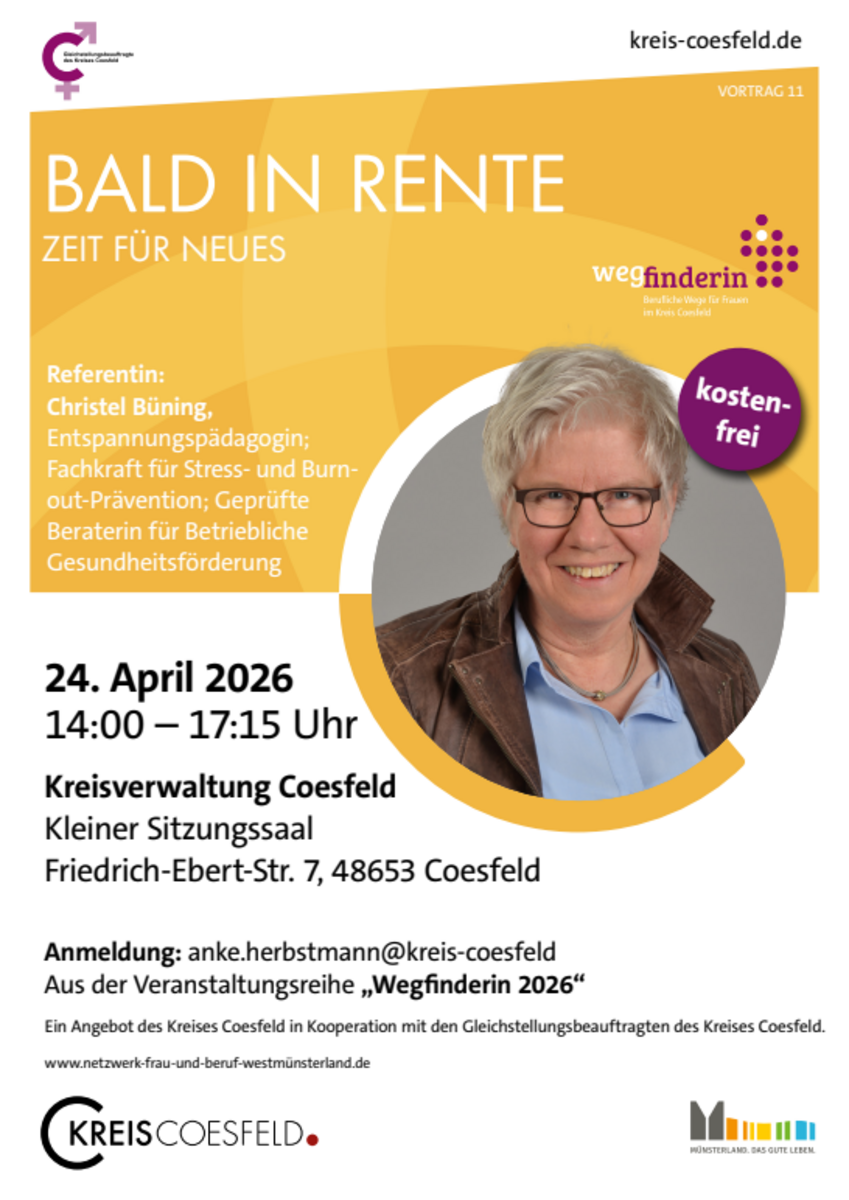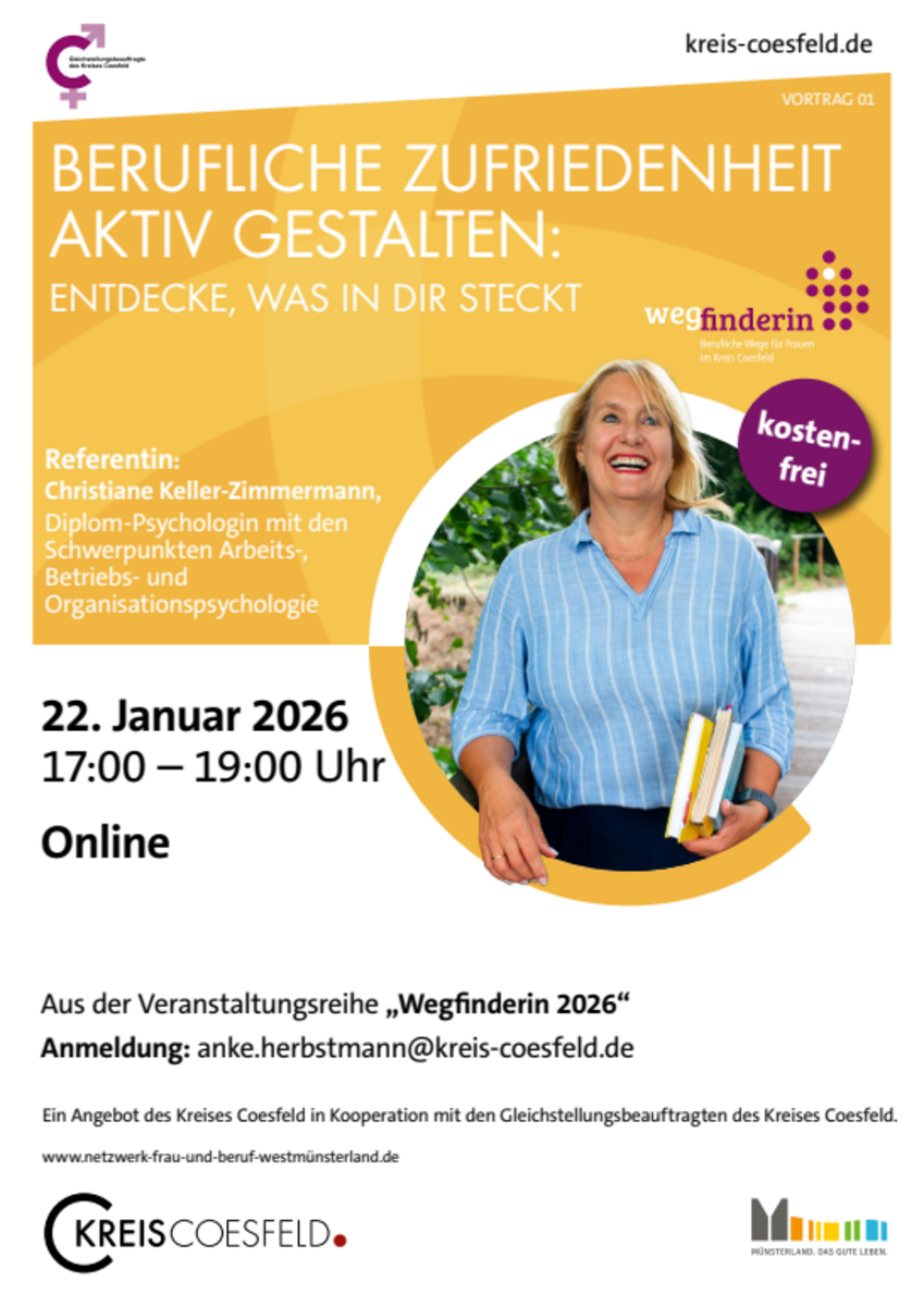 Anmeldung erforderlich: gleichstellung(at)gemeinde.havixbeck.deDer Vortrag findet im Rahmen der Veranstaltungsreihe "Wegfinderin - Einfach mal die Perspektive ändern" statt, die die Gleichstellungsbeauftragten im Kreis Coesfeld organisieren.