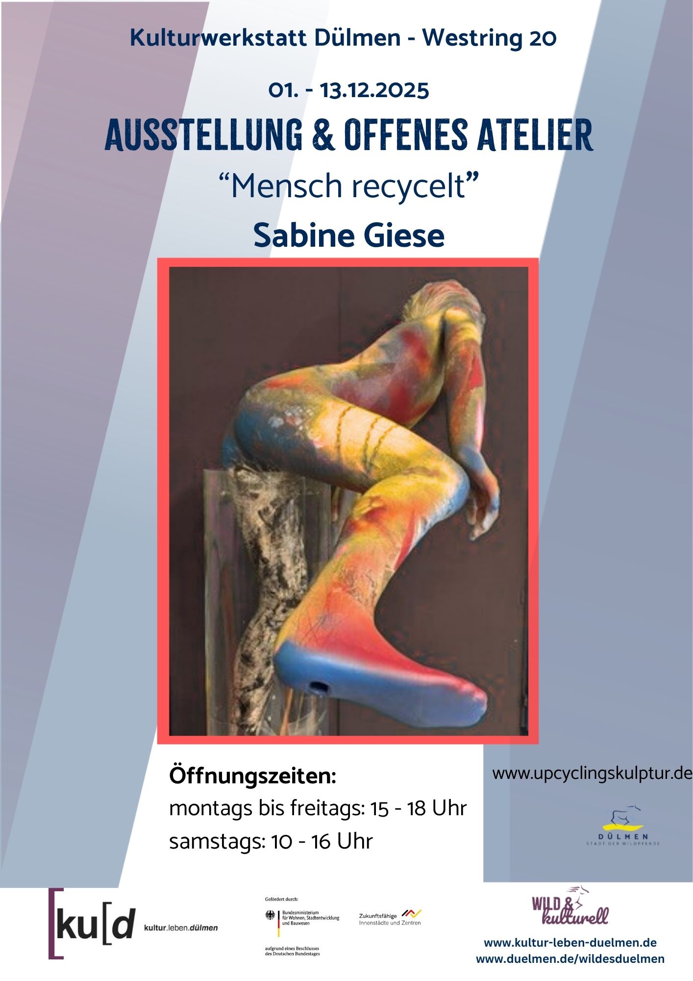Im Rahmen des Förderprogramms "Zukunftsfähige Innenstädte und Zentren" kurz ZIZ entstehen derzeit viele unterschiedliche Projekte in der Dülmener Innenstadt. Eine Übersicht findet sich unter www.duelmen.de/wildesduelmen. Unter anderem hat das Kulturbüro seit August 2023 ein Ladenlokal angemietet und stellt es nun den Kulturakteuren der Stadt für Ausstellungen und kleine Veranstaltungen zur Verfügung. Es soll ein kultureller Freiraum und ein kleines, aber feines kulturelles Zentrum Mitten in der Stadt entstehen. Premiere feierte die Kulturwerkstatt am Westring 20 während der Kulturnacht. Und seitdem reißt die Nachfrage nicht ab! Aktuelle Infos finden Sie hier auf der Homepage!
