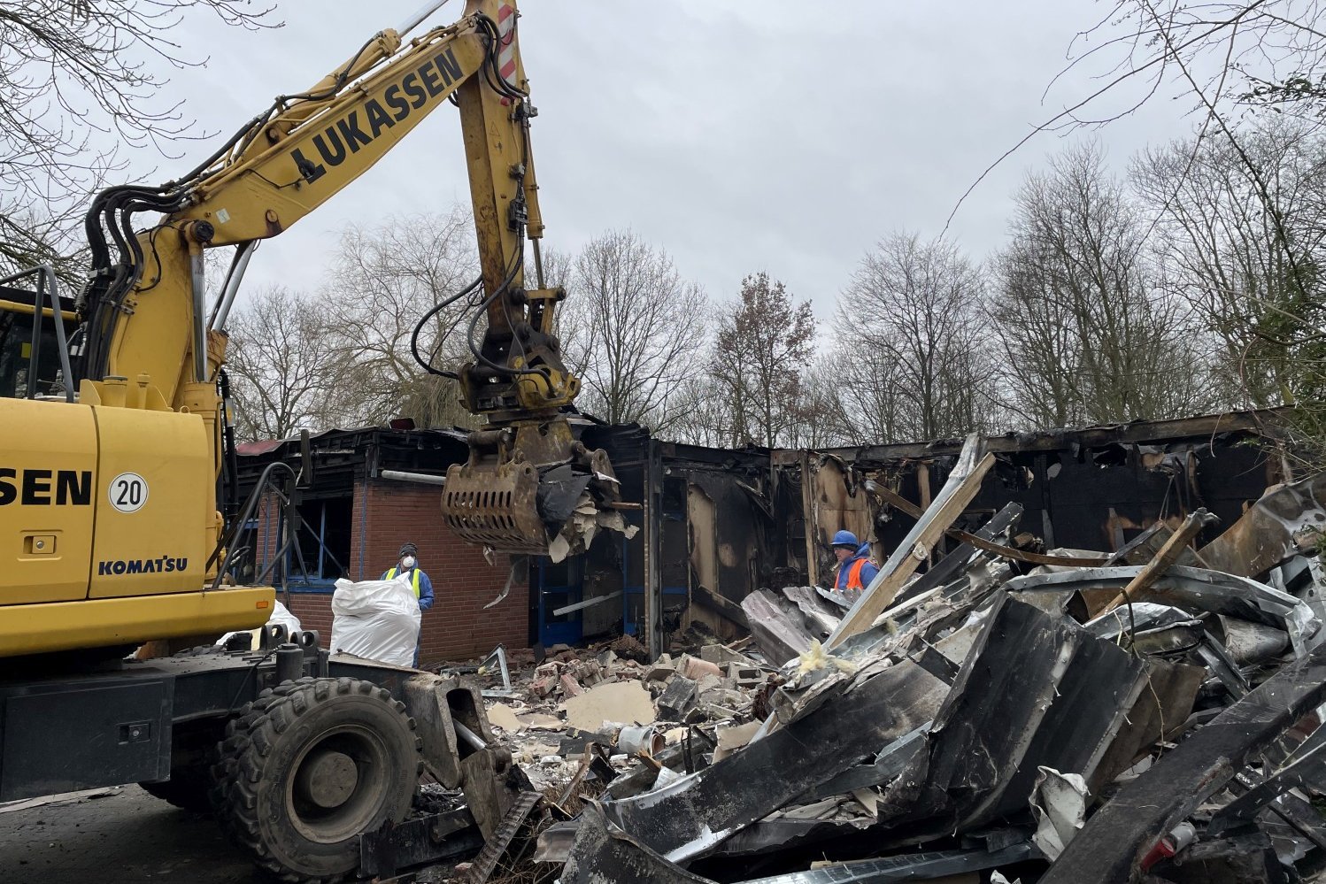 Aufgrund der starken Zerstörung des Gebäudes erfolgt der Abriss in Abschnitten und auf Basis eines in den vergangenen Wochen erstellten Gutachtens. Zunächst wird die verbliebene Dachkonstruktion abgenommen. Anschließend werden Gebäude-Materialien getrennt und entsorgt.