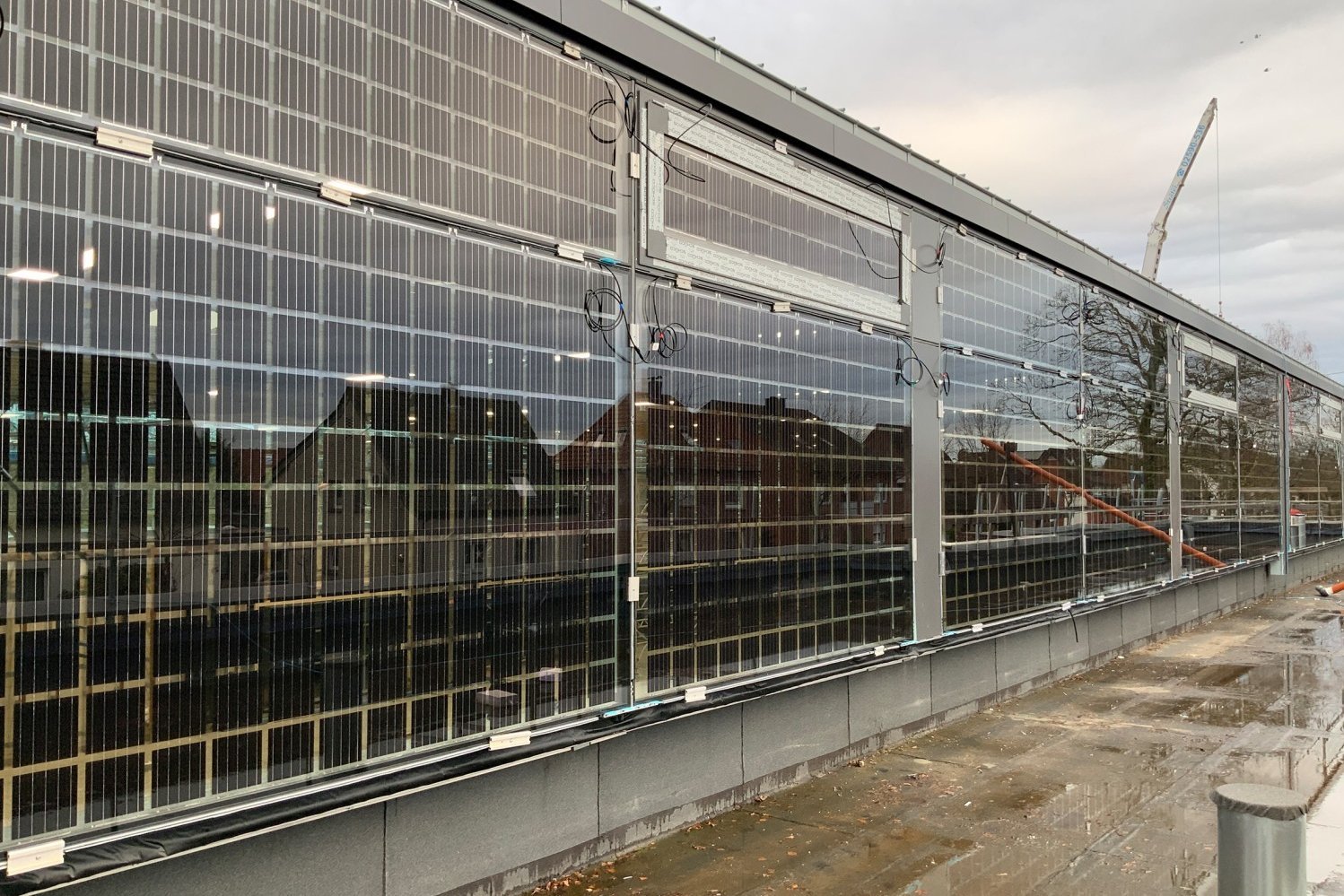 Zwölf große Panels sind an der Frontfassade angebracht: Jedes davon ist drei Meter breit, zwei Meter hoch und beinhaltet rund 160 Photovoltaik-Zellen. Schlanke 410 Kilogramm bringt eine einzelne Scheibe auf die Waage. Wer befürchtet, dass in der Halle dadurch zwangsläufig Finsternis herrscht, irrt: Kleine Freiräume zwischen den Zellen lassen das Tageslicht ins Innere. Die Panels fungieren vielmehr als cleverer Sonnenschutz in der Sommerzeit.