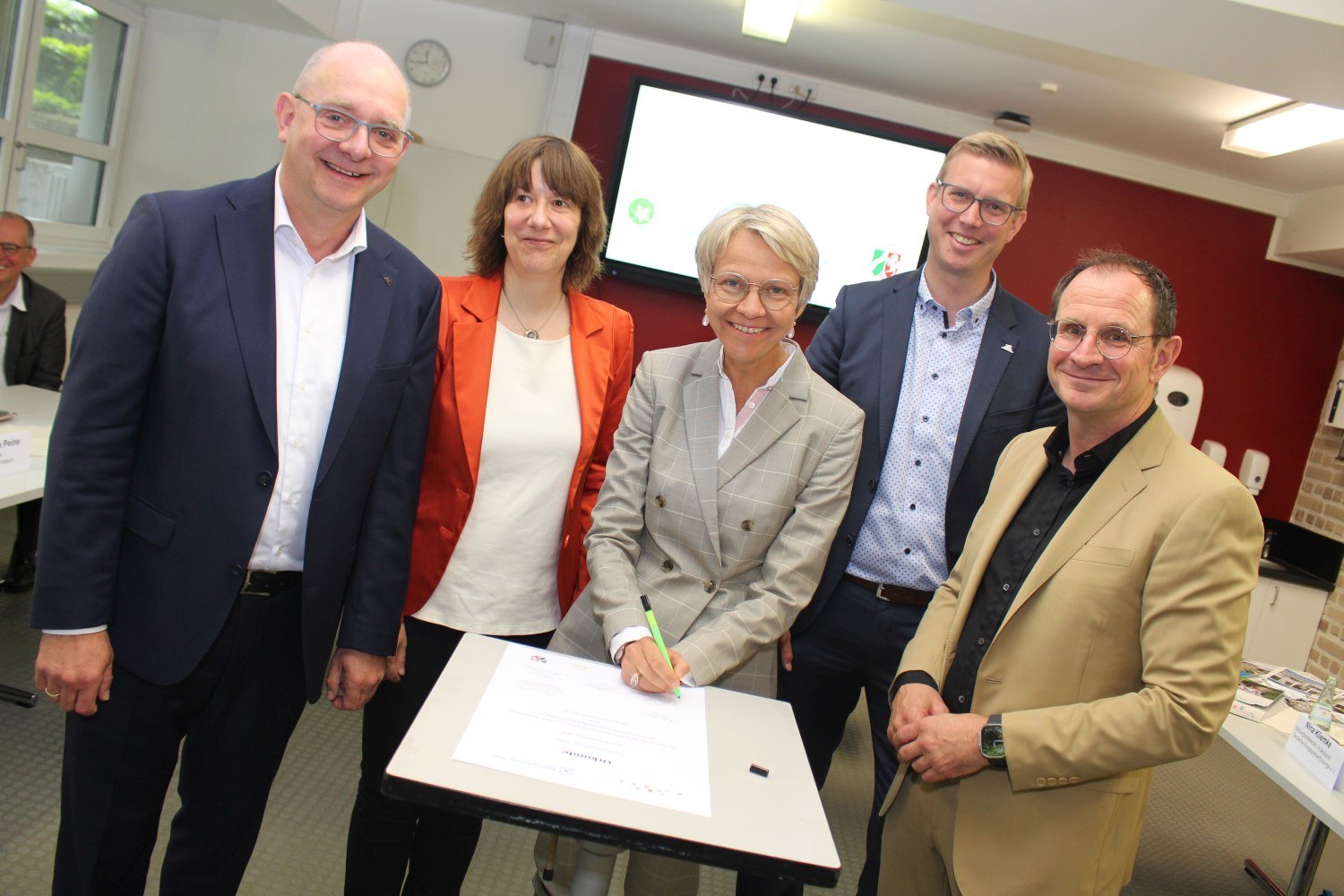 Die Hermann-Leeser-Schule und der Volksbund Deutsche Kriegsgräberfürsorge e.V. haben eine Bildungspartnerschaft geschlossen: Neben Schulleiter Robert Schneider und Astrid Wolters (Volksbund) unterzeichneten auch Dorothee Feller (NRW-Ministerin für Schule und Bildung), der Landtagsabgeordnete André Stinka und Bürgermeister Carsten Hövekamp die Urkunde. Schule und Volksbund entwickeln derzeit gemeinsam ein friedenspädagogisches Lernangebot für die Jahrgangsstufen 9 und 10: Es umfasst die beiden Weltkriege ebenso wie den Kalten Krieg und führt zu besonderen Erinnerungsorten - wie beispielsweise dem Sondermunitionsdepot Visbeck.