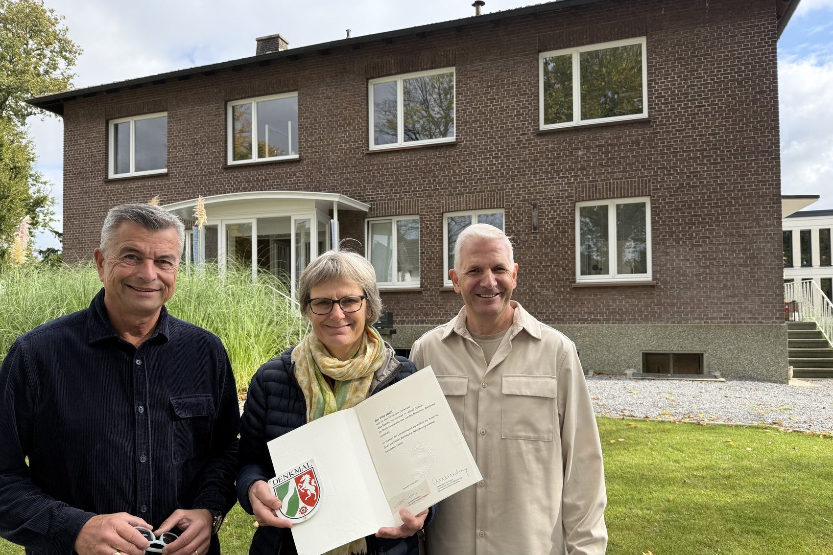 Als Anerkennung für den gelungenen Umbau und für die Verpflichtung zum Erhalt des Denkmals überreichte Kirsten Apke-Lobmeyer im Namen des Landes NRW die Denkmalplakette nebst Urkunde an Carsten Göbel, der sie auch stellvertretend für seine Frau Karin entgegennahm. „Denkmäler sind ein gebautes Zeugnis unserer Vergangenheit und Kultur. Wir können an ihnen unsere Geschichte ablesen. Darum ist ihr Erhalt so wichtig und nur durch engagierte Eigentümer möglich“, so die Denkmal-Expertin. „Den Bauherren ist es mit viel Fingerspitzengefühl und Liebe zum Detail gelungen, die Villa technisch in 21. Jahrhundert zu transformieren, ohne ihren Charakter wesentlich zu verändern.“