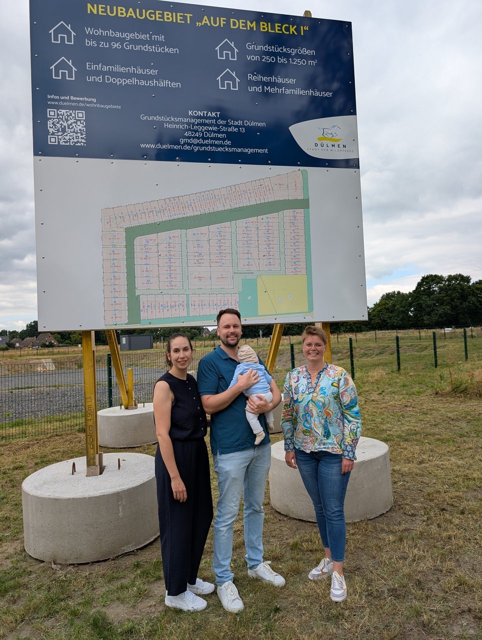 Die Tinte unter dem ersten Kaufvertrag für das Neubaugebiet „Auf dem Bleck I“ ist trocken: Das Grundstück gehört nun Katharina und Dennis Bergmann (hier mit Söhnchen Enno), die dort ein Doppelhaus bauen möchten. Kristin Schulz vom Grundstücksmanagement der Stadt Dülmen gratulierte der jungen Familie zum Kauf. Die Verträge für weiter Grundstücke, die die Stadt Dülmen vermarktet, sind bereits beurkundet.