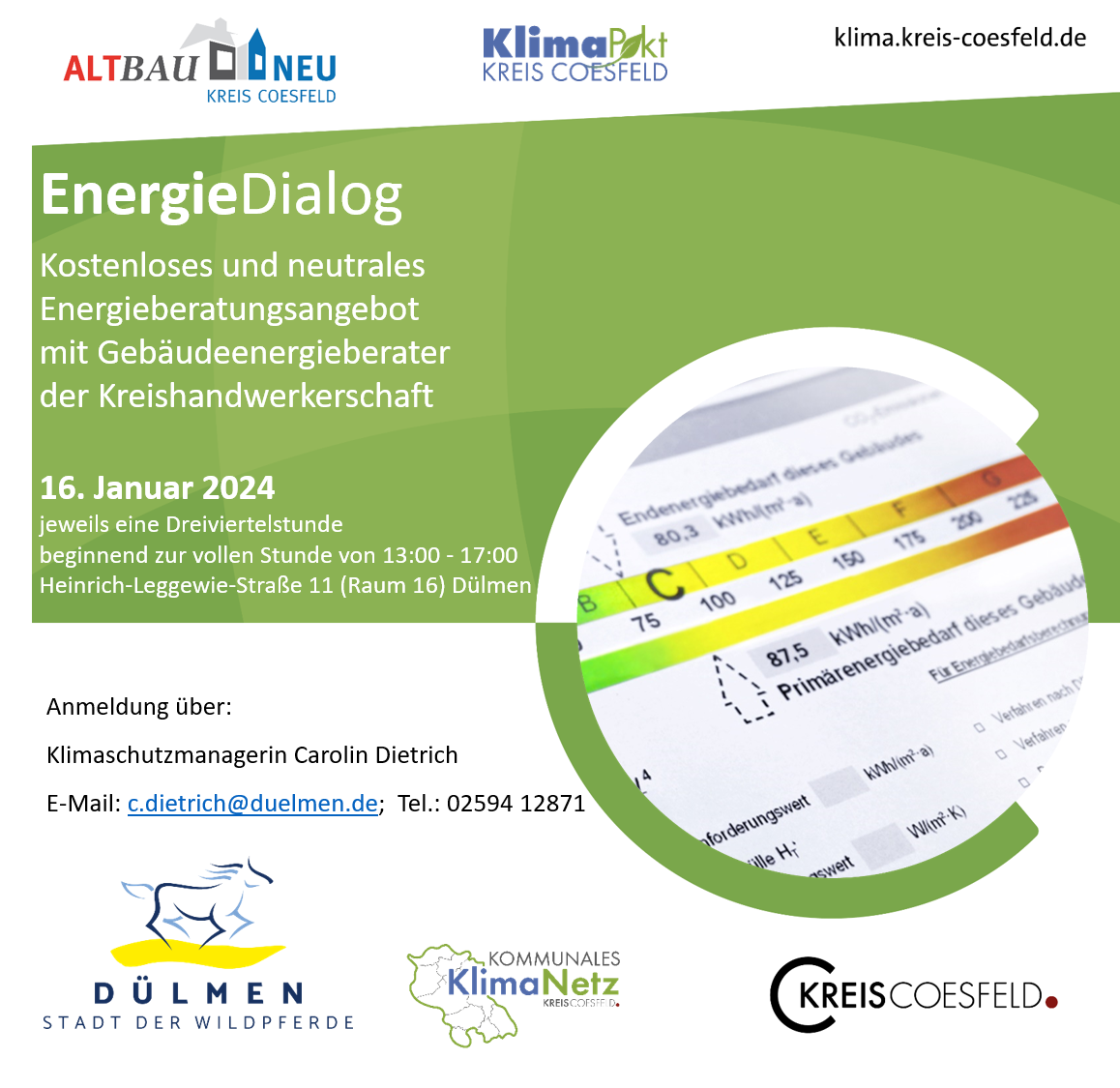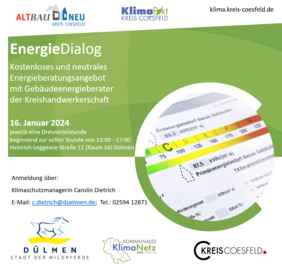 Auch im kommenden Jahr bieten die Stadt Dülmen und der Kreis Coesfeld wieder EnergieDialoge an: Der kommende kostenlose Beratungstermin für Bürgerinnen und Bürger findet am Dienstag, 7. Januar, von 13 bis 17 Uhr im Technischen Rathaus (Raum 16) in der Heinrich-Leggewie-Straße statt. Energieberater der Kreishandwerkerschaft klären in einstündigen Terminfenstern Fragen rund um die Themen der energetischen Gebäudesanierung, Wärmeversorgung und Photovoltaik.
