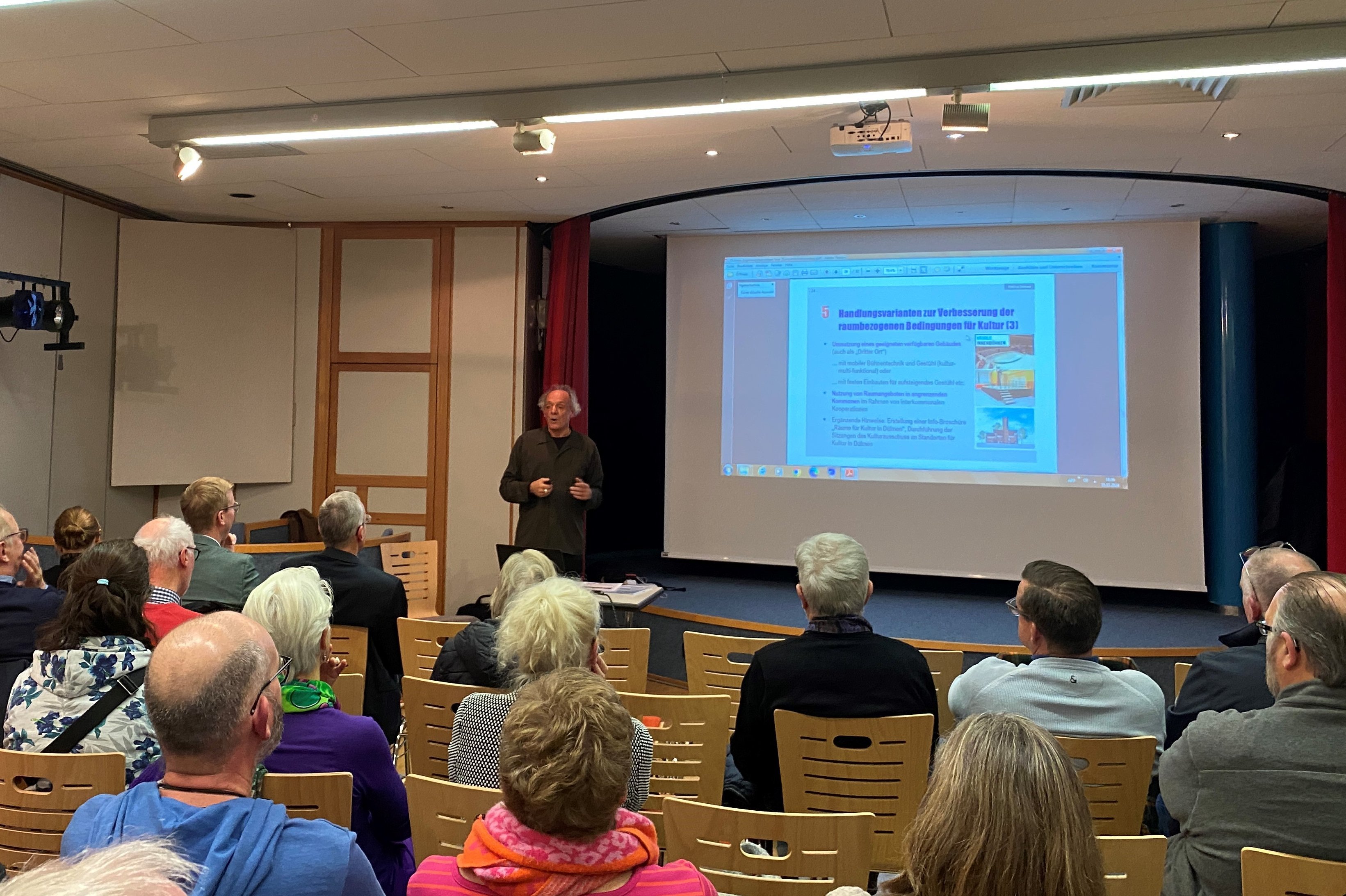 Wie bewerten Kulturakteurinnen und -akteure, aber auch Besucherinnen und Besucher die Räume für kulturelle Veranstaltungen in Dülmen? Die Ergebnisse der Bedarfsanalyse "Kulturelle Räume" stellte das städtische Kulturteam am Freitag, 15. November, in der Alten Sparkasse vor. Gut 40 Vertreterinnen und Vertreter von Kulturvereinen und weitere Aktive begrüßte Bürgermeister Carsten Hövekamp, bevor Ralf Ebert vom Planungs- und Beratungsbüros StadtART aus Dortmund die zentralen Ergebnisse der dreistufigen Untersuchung präsentierte.