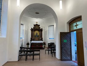 Auch im Innern ist die Kapelle kaum wiederzuerkennen: War sie früher geprägt von verwaschenen Wandfarben, dunklen Decken und schweren Holzbänken, erstrahlt sie heute in frischem Weiß. Besonderer Blickfang ist nach wie vor der barocke Altar. Die Farben der aufwändig aufgearbeiteten Gemälde leuchten wieder, die massiven Bänke sind einer modernen, schlichten Bestuhlung gewichen, die für Veranstaltungen entfernt werden kann. Auch Fenster und Böden wurden erneuert. „Im Zuge der Renovierung wurden viele gute Entscheidungen mit viel Liebe zum Detail getroffen“, betont Kirsten Apke-Lobmeyer, die das Projekt von städtischer Seite begleitet hatte. „Die Kapelle wirkt nun wieder sehr lebendig.“