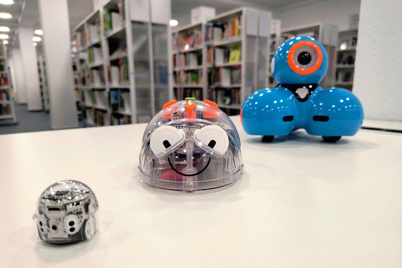 Er ist blau, fährt auf drei Rädern und hat ein leuchtendes Auge: Die Rede ist vom Roboter Dash der Stadtbücherei. Mit Bluetooth verbunden kann er durch eine zugehörige App spielerisch und einfach gesteuert werden. „30cm geradeaus fahren, nach oben schauen und Hallo sagen“ ist für den kleinen Blechkameraden ein Leichtes. Mit seinen sieben Kollegen können Schulklassen ihn im Set ausleihen, um die Welt des Programmierens so interessant und anschaulich wie möglich kennenzulernen.