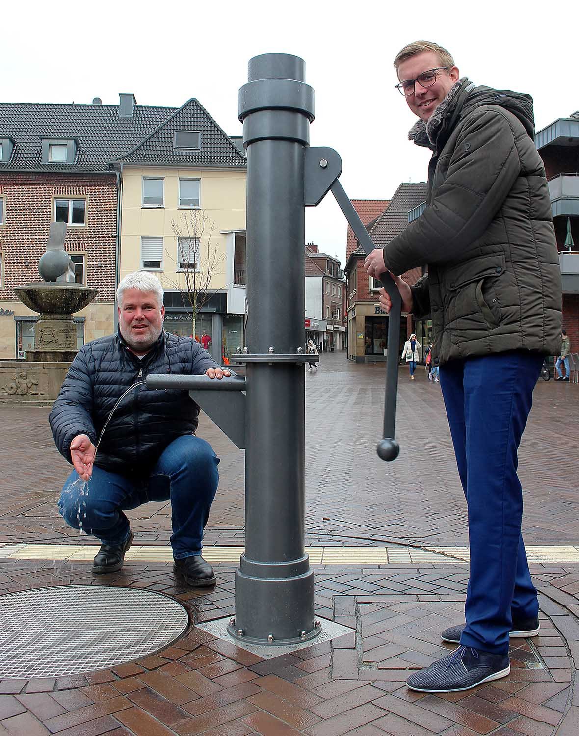 Eine Schwengelpumpe steht seit heute Morgen auf dem Dülmener Marktplatz – und zwar genau an der Stelle, an der bei den archäologischen Ausgrabungen der historische Brunnenschacht gefunden wurde. Die Pumpe ist nicht nur ein Blickfang, sondern auch voll einsatzbereit: Wird der Schwengel bedient, fließt Wasser. Die Stadt Dülmen weist darauf hin, dass es sich hierbei nicht um Trinkwasser handelt. Ein entsprechender Hinweis ist an der Pumpe angebracht. Trinkwasser kann an dem Spender in der Viktorstraße vor Dülmen Marketing entnommen werden.