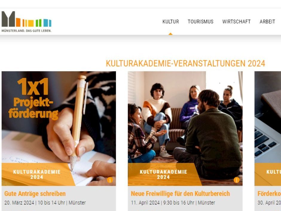 Jahr für Jahr bietet die "Kulturakademie Münsterland" ein abwechlungsreiches und informatives Fortbildungsprogramm rund um die Themen "Kulturmanagemnt" und "Förderung". Das neue Programm kann unter www.muensterland.com/kultur/weiterbildung/kulturakademie/ eingesehen werden.