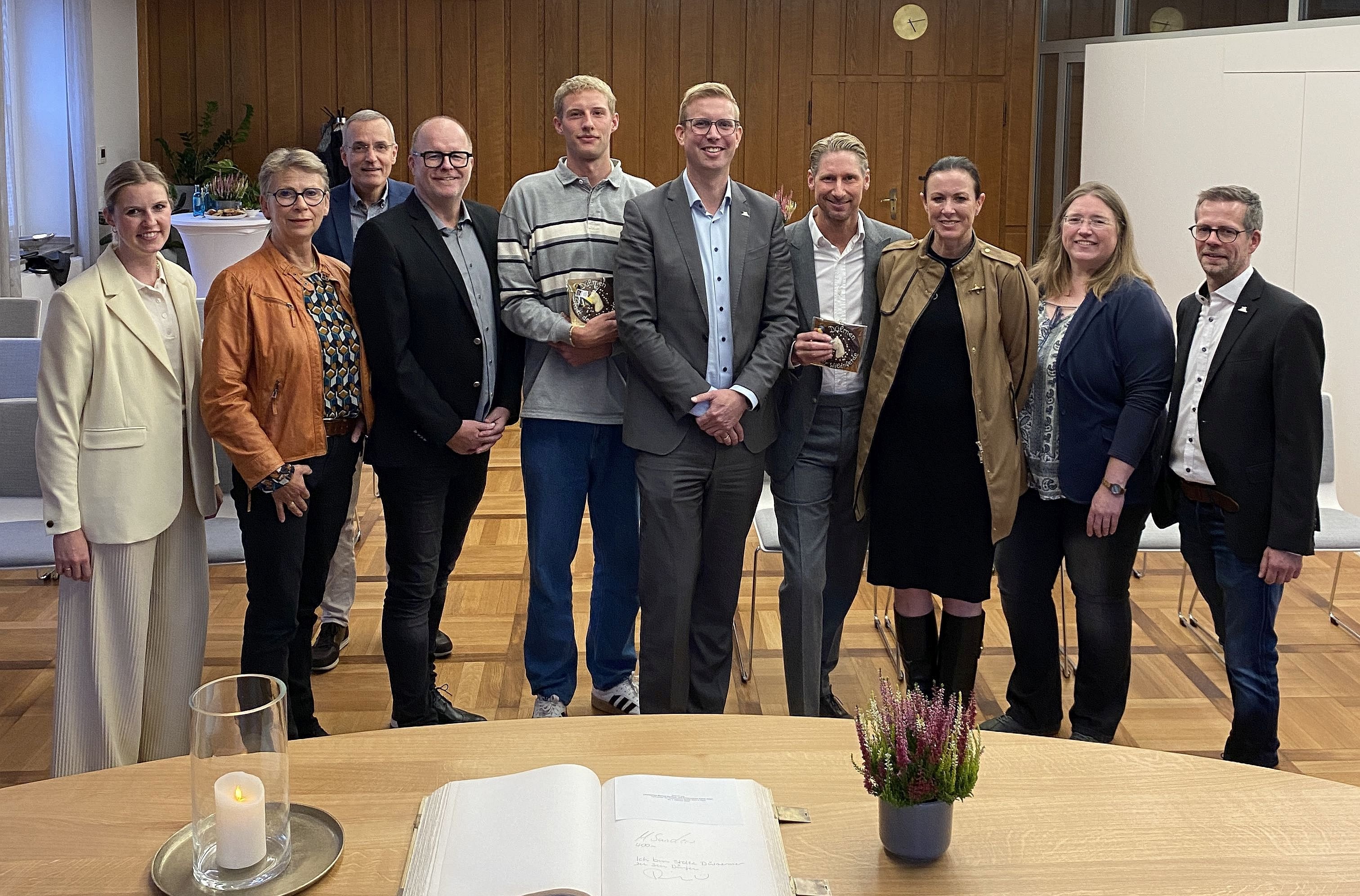 Beide Olympioniken freuten sich sichtlich über die Ehre, sich in das Goldene Buch eintragen zu dürfen. Im lockeren Austausch mit Bürgermeister Carsten Hövekamp und den anderen Gästen berichteten sie von ihrem Leben als Leistungssportler und ihren Erfahrungen bei den Olympischen Spielen in Paris. So schwärmte Patrik Kittel von der Atmosphäre bei den Dressur-Wettbewerben vor dem Schloss von Verseilles, während Manuel Sanders das Gänsehaut-Gefühl vor 70.000 Leichtathletik-Fans im „Stade de France“ beschrieb.