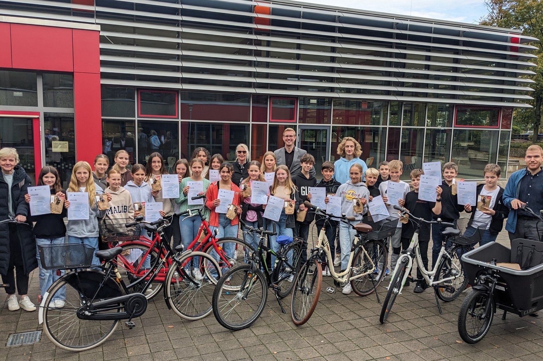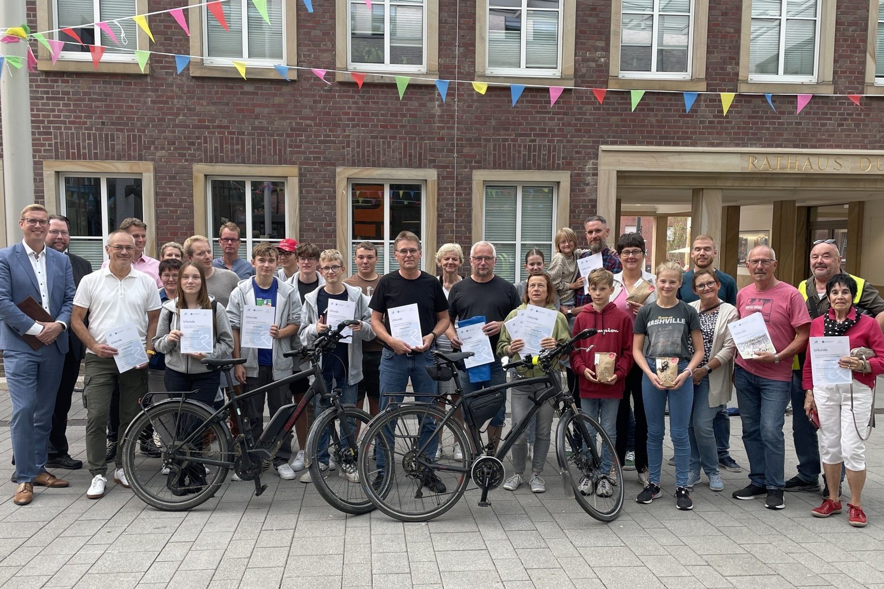 Die Stadt Dülmen hat Teilnehmerinnen und Teilnehmer der Aktion „STADTRADELN“ geehrt: Bürgermeister Carsten Hövekamp zeichnete die erfolgreichsten Radler aus und übergab Sachpreise sowie Urkunden. Vom 1. bis 21. Mai legten die Teilnehmenden 213.141 Kilometer zurück und stellten damit einen neuen Rekord auf: Der bisherige Bestwert aus dem vergangenen Jahr wurde um rund 18.000 Kilometer übertroffen.