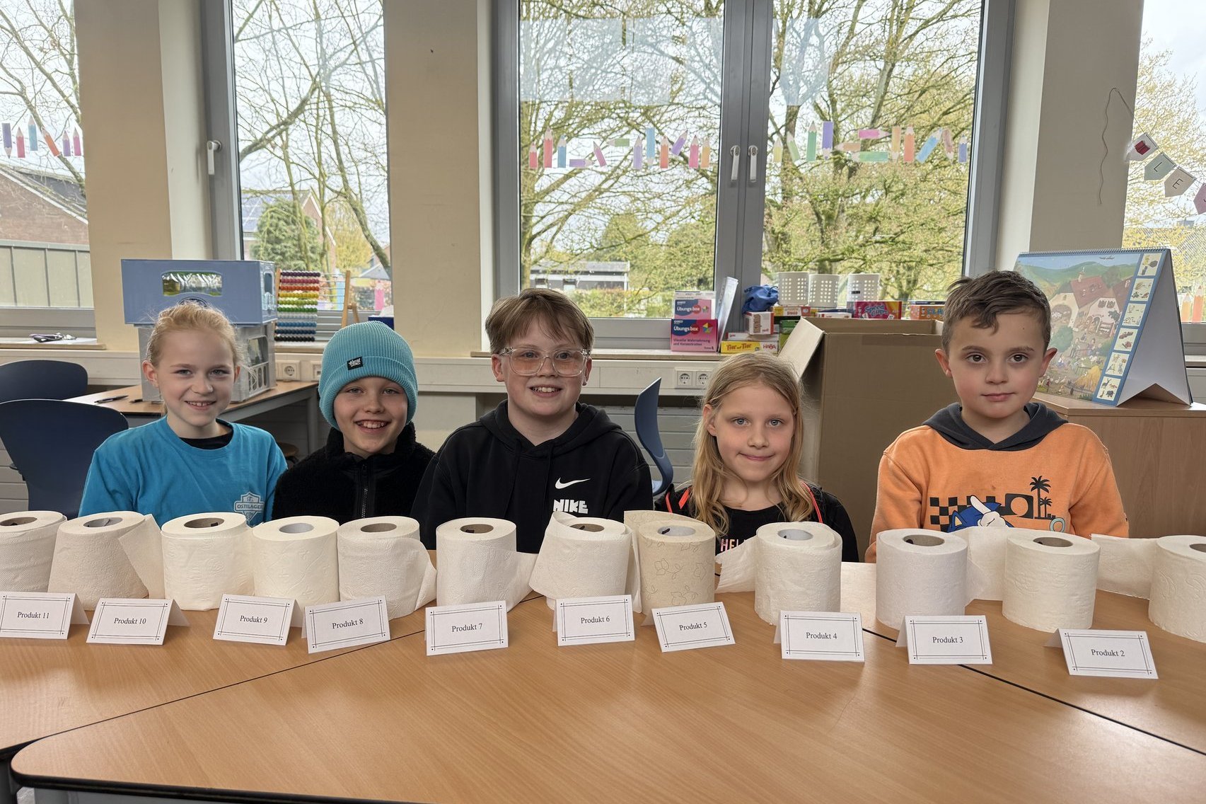 Eine außergewöhnliche Aufgabe hatten heute fünf ehemalige und aktuelle Schülerinnen und Schüler der Paul-Gerhardt-Grundschule: Gemeinsam mit Bürgermeister Carsten Hövekamp sowie Vertretern der Stadt Dülmen beurteilten sie die Qualität unterschiedlicher Toilettenpapiersorten. Der Hintergrund des kuriosen Termins: Die Kinder hatten sich im Oktober 2024 mit einem Brief an Bürgermeister Carsten Hövekamp gewandt und sich besseres Toilettenpapier für ihre Schule gewünscht. Hövekamp traf sich damals mit den Schülerinnen und Schülern und sagte zu, dass sie bei der nächsten städtischen Ausschreibung für Toilettenpapier an der Auswahl beteiligt werden. Dieses Versprechen löste der Bürgermeister nun ein.