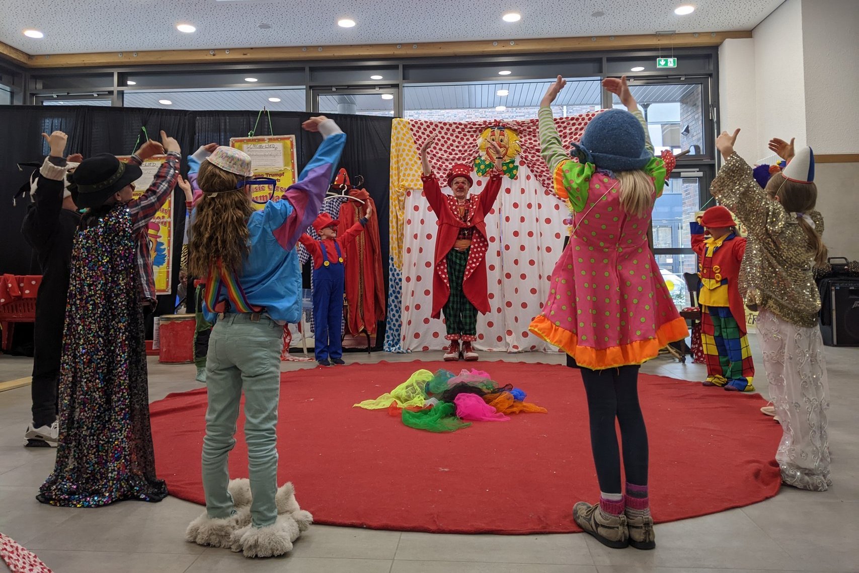 „Manege frei!“ hieß es am Montag, 4. Dezember, für zwölf OGS-Kinder der Augustinus-Grundschule. In der neuen Mensa präsentierten sie vor ihren Familien stolz die Ergebnisse ihres Zirkus-Projektes. Als tollpatschige Clowns, „gefährliche“ Plüsch-Raubtiere oder Zauberin im Glitzerumhang gestalteten die Schülerinnen und Schüler gemeinsam eine bunte Show. Seit den Herbstferien hatten sie unter fachkundiger Anleitung Wolfgang Konerding – alias Clown Fidelidad – für ihren großen Auftritt trainiert. Einmal wöchentlich nutzten sie dafür die Zeit in der Offenen Ganztagsgrundschule (OGS), die vom Sozialdienst katholischer Frauen (skf) organisiert wird. Clown Fidelidad vermittelte eine Menge seines Könnens und begleitete die Kinder anschließend durch ihre Vorführung. Mit Begeisterung und viel Engagement schlüpften die Kinder in ihre Rollen und ernteten großen Applaus vom Publikum.