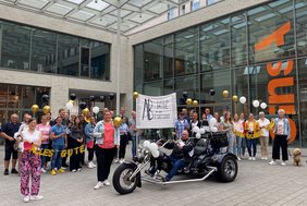 Da staunte Volker Dieminger nicht schlecht, als am Freitagmorgen, 30. August, sechs glänzende Trikes vor seiner Haustür vorfuhren. Die Eskorte brachte den Leiter des Fachbereichs Zentrale Dienste – nach 37 Jahren bei der Stadt Dülmen – an seinem letzten Arbeitstag standesgemäß zum Rathaus. Bürgermeister Carsten Hövekamp sowie die Abteilungsleitenden seines Fachbereichs saßen – ebenso wie Volker Dieminger selbst – auf den Rücksitzen der schicken Fahrzeuge. Das Steuer hatten Mitglieder von Diemingers Trike-Club übernommen. Auf dem Markt der Möglichkeiten begrüßten zahlreiche Mitarbeiterinnen und Mitarbeiter des Fachbereichs ihren Chef mit Ballons, Fähnchen, einem Banner und viel Applaus. Sichtlich gerührt bedankte sich Volker Dieminger für den herzlichen Empfang.