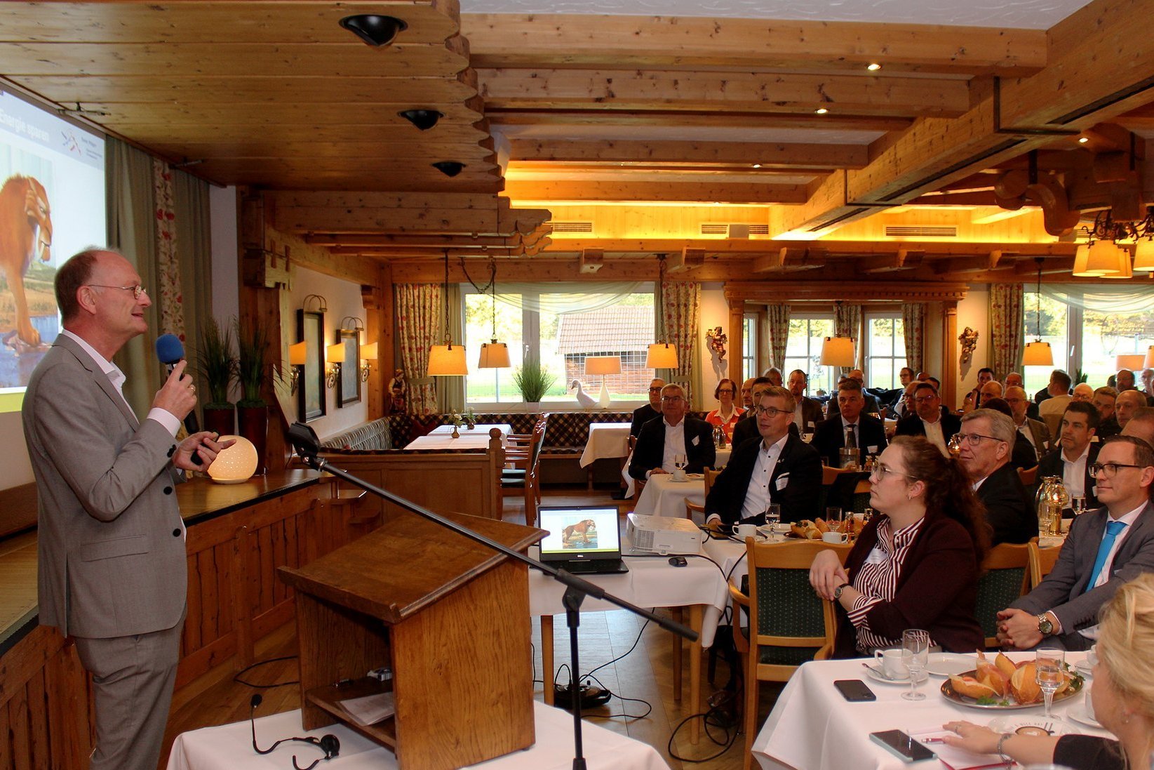 Neuer Besucherrekord für das Unternehmerfrühstück: Rund 140 Gäste nahmen am Mittwoch, 8. November, an der beliebten Veranstaltung teil, zu der die Wirtschaftsförderung der Stadt Dülmen und die Sparkasse Westmünsterland ins Haus Waldfrieden eingeladen hatten. Die Teilnehmerinnen und Teilnehmer genossen nicht nur ein reichhaltiges Frühstück und die Gelegenheit zum lockeren Austausch, sondern vor allem den ebenso informativen wie unterhaltsamen Vortrag von TV-Meteorologe und Bestseller-Autor Sven Plöger zum Thema „Klima und Marktwirtschaft – Was braucht es für ein erfolgreiches Morgen?“