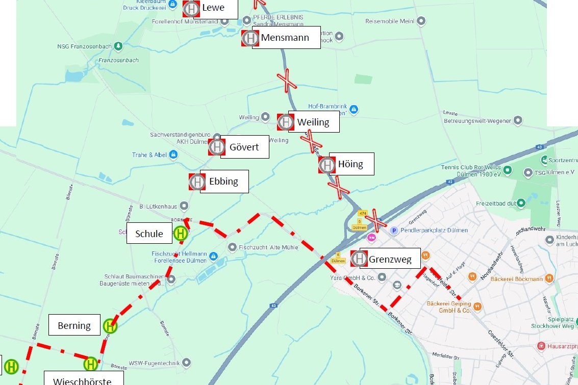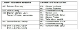 Aufgrund der Vollsperrung der L611 werden sich nach den Ferien die Haltestellen der Schulbuslinien 662 und 650 ändern. Die Linie 662 Börnste Dülmen wird nach der der Haltestelle „Dülmen, Flagenhof“ wie gewohnt die Borkener Straße nutzen, allerdings nicht mehr in den Grenzweg abbiegen, sondern der Borkener Straße bis zur Kreuzung „Börnste“ folgen. Dann biegt der Bus auf die gewohnte Linie zur Haltestelle „Dülmen-Börnste Schule“ ab. In dieser Zeit können die Haltestellen „Dülmen, Grenzweg“; „Dülmen-Börnste, Höing“; „Dülmen-Börnste, Weiling“; „Dülmen-Börnste, Lewe“; „Dülmen-Börnste, Mensmann“; „Dülmen-Börnste, Gövert“ und „Dülmen-Börnste, Ebbing“ nicht mehr bedient werden. Alternative Einstiegsmöglichkeiten bieten die Linien 650, 654 und 580 (siehe Übersichtstabelle). Die Linie 650 biegt für die Baustellenzeit vor der Vollsperrung in de Straße Hanninghof ein. Hier werden Parkverbote eingerichtet, damit ein Busverkehr möglich ist. Über die Borkener Straße fährt die Linie dann weiter nach Merfeld.