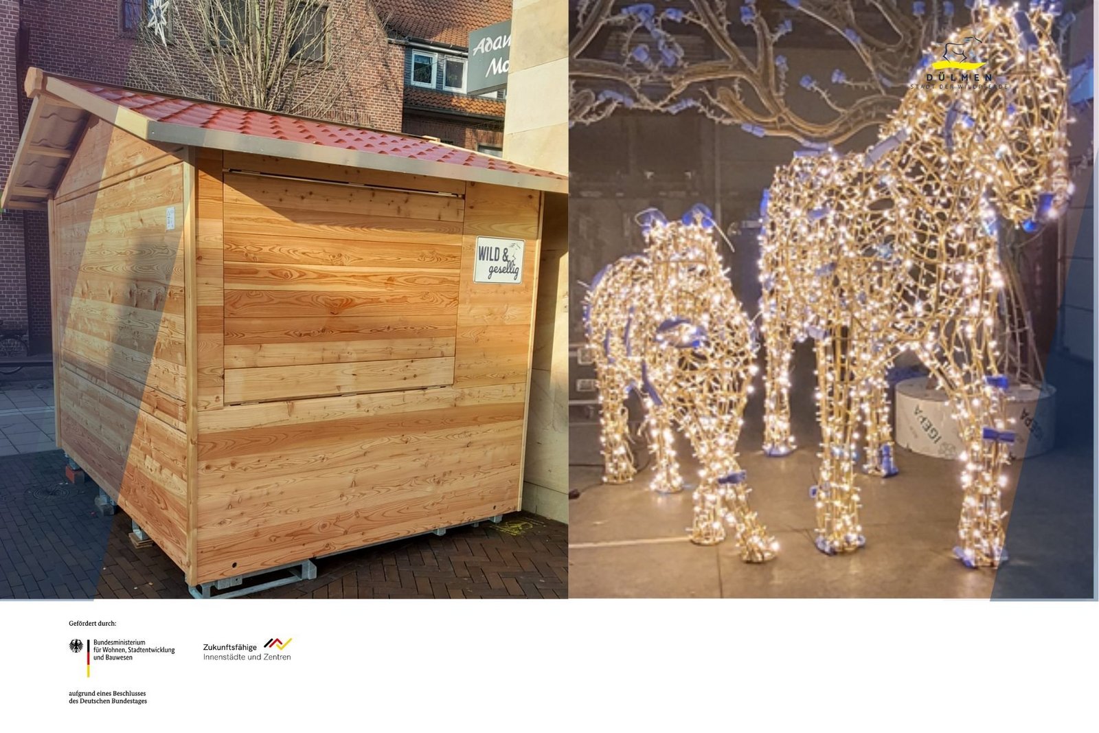 Der Dülmener Winter stellt in der Weihnachtszeit in der Region den größten und längsten Weihnachtsmarkt dar. In den über 50 Tagen Spielzeit von Mitte November bis Anfang Januar besuchen hunderttausende Gäste Dülmen. Mit drei Maßnahmen wird der Dülmener Winter für die Gäste noch attraktiver: Ein neues Beleuchtungskonzept erhöht die Attraktivität des Weihnachtsmarktes auf dem Kirchplatz. Zwei „wilde Pferde“ begrüßen die Gäste und laden ein über den beleuchteten Kirchplatz zu schlendern. Neue Eventhütten runden das attraktive Bild des Weihnachtsmarktes ab.