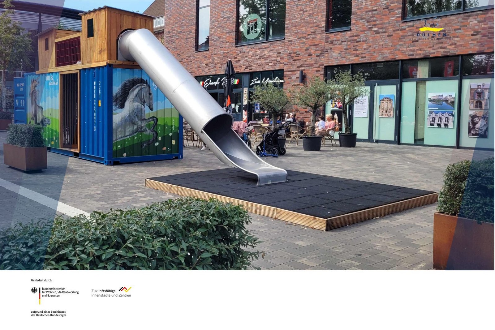 Das wilde Spieleparadies zum Austoben für die kleinen Dülmener! Im Rahmen des Förderprojektes ,,Zukunftsfähige Innenstädte und Zentren (ZIZ)“ dient der mobile Spieleparcours als In- und Outdoor-Spielcontainer an eher frequenzarmen Orten und Plätzen in der Dülmener Innenstadt. Erster Aufstellort des Spieleparcours ist der Overbergplatz. Der mobile Spieleparcours besteht aus diversen Klettermöglichkeiten, einer wilden Rutsche und einem kleinen Spielhäuschen. Durch das auffallende Wildpferde-Graffiti und den Aufschriften ,,wild & spielerisch“ und ,,wild & dynamisch“ wird die Dachmarke ,,Stadt der Wildpferde“ gestärkt und soll zugleich die Identifikation der Bürgerinnen und Bürger mit ihrer Innenstadt intensivieren.