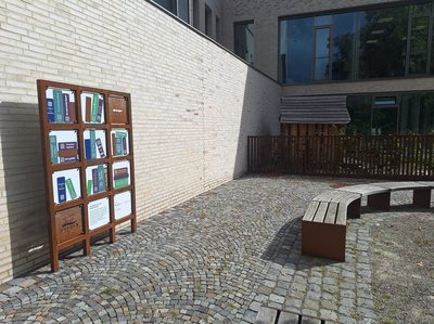 Das stilisierte Bücherregal auf dem Kirchplatz, steht mitten im Herzen der Stadt. Sie können dort über einen QR-Code Geschichten von Dülmenerinnen und Dülmenern herunterladen und in aller Ruhe lesen! Unser Tipp: Die Lesedauer ist genau passend für die Mittagspause!