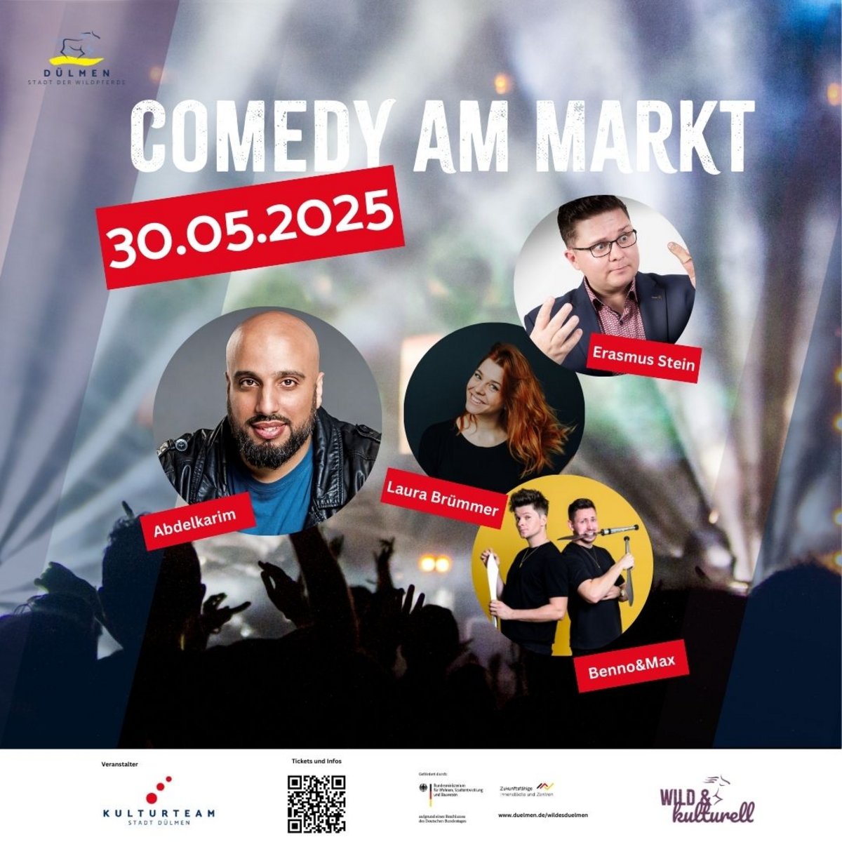In 2025 wird ein weiterer Wunsch der Bürgerinnen und Bürger umgesetzt: ein Comedy-Festival in der Innenstadt! Abdelkarim, Laura Brümmer und Menno&Max stehen an diesem Abend auf der Bühne. Moderiert wird die Show von Erasmus Stein.